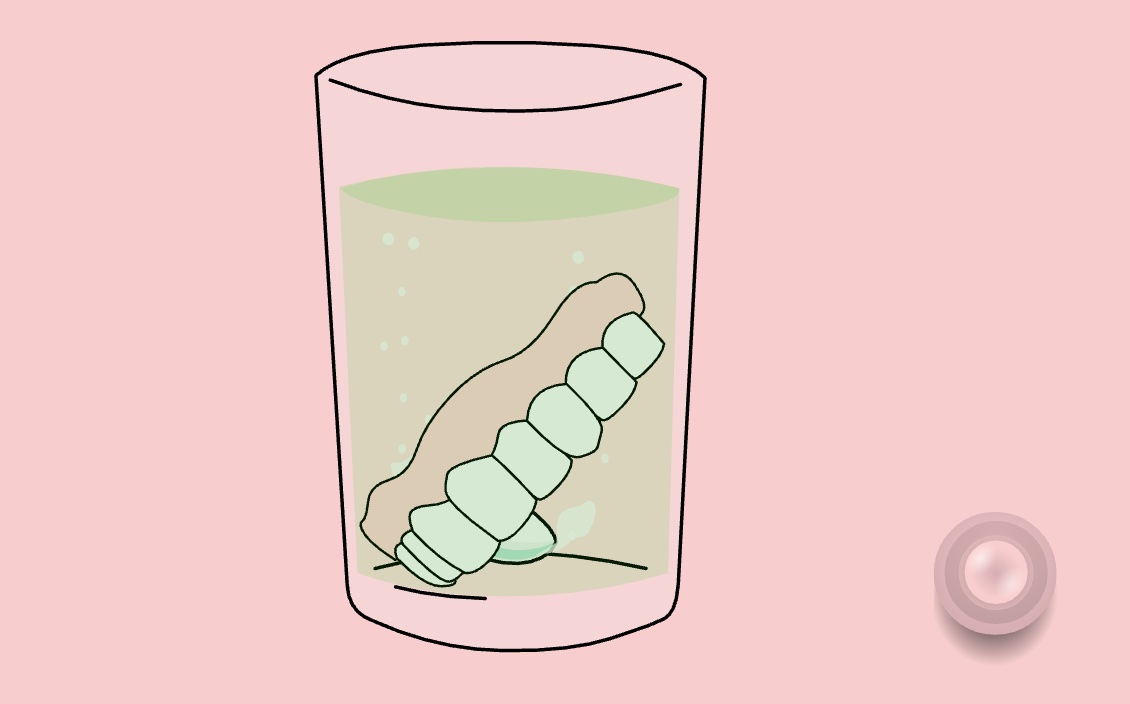유리컵에 물을 담아 회색으로 변색된 틀니, 틀니 세정제를 넣어줍니다.