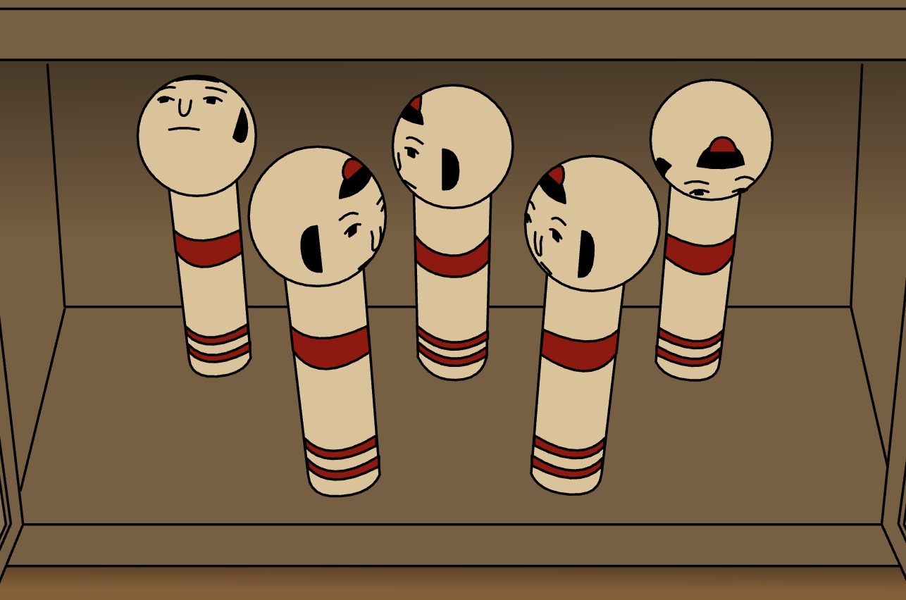 목각 인형이 모두 위쪽을 보고 있습니다.