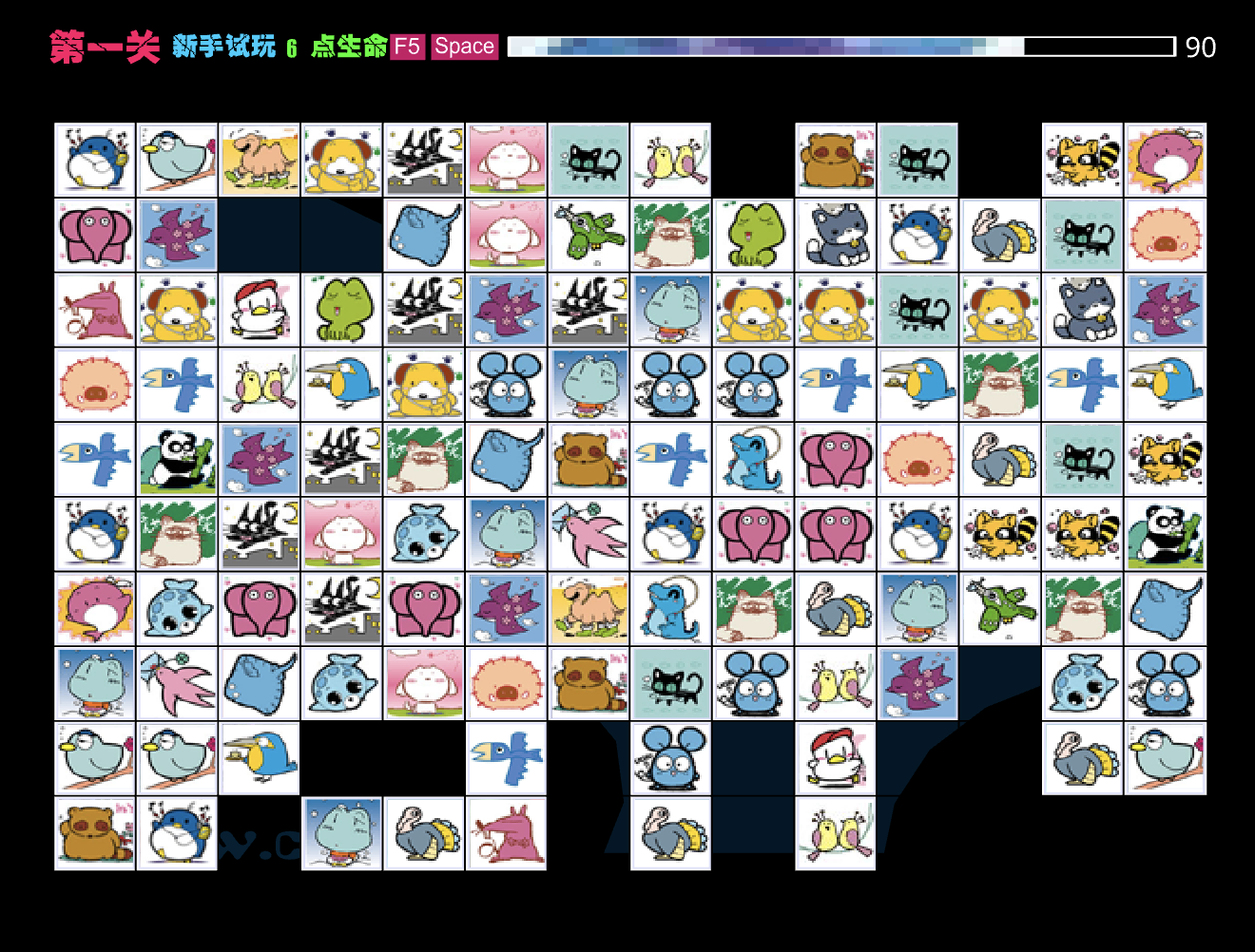 게임방법: 2번 이하로 꺾이는 구간에 있는 같은 동물 모양을 선택해서 없애세요